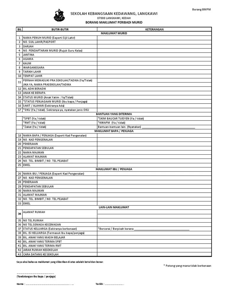 Related : Lampiran A Borang Maklumat Murid - Rasanya sama saja semua sekolah sebab menggunakan borang dari kementerian pendidikan malaysia..