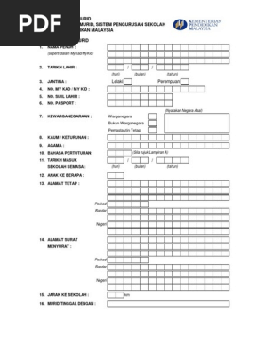 Borang maklumat muridnama :(seperti dlm mykid). Terima kasih di atas kerjasama anda. Modul pengurusan murid, sistem pengurusan sekolah. * berikut merupakan borang maklumat murid yang telah dihasilkan berdasarkan aplikasi pangkalan data murid. Untuk rujukan ibu bapa semasa mengisi borang maklumat murid. Pusat bandar chini, 26690 chini,pahang darul makmur. Untuk pengetahuan ibu bapa di luar sana, sistem permohonan pendaftaran secara dalam online untuk kemasukan murid ke tahun satu sekolah rendah kerajaan (kementerian pendidikan malaysia) bagi seluruh negeri di semenanjung malaysia. Sila rujuk lampiran a 11. Maklumat murid perlu dikemaskini setiap tahun oleh ibubapa. ( diisi oleh ibu/bapa/penjaga ). Ya tidak (sila rujuk lampiran a) jika ya, program kategori jenis bank no. Saya sudah convertkan kepada excel. * sila tanda √ jika bersetuju lampiran a.