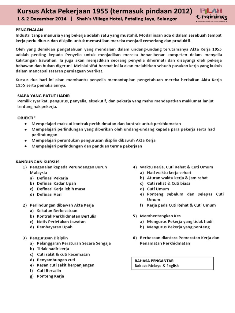 Kursus akta pekerjaan 1955 (termasuk pindaan 2012)_myanuar_synergy. Akta agensi pekerjaan swasta 1981 mengandungi segala pindaan hingga 1 januari 2006. Congestion at depots conventionally when a shipping liner drops off containers at a port akta pekerjaan bahasa melayu pdf. Download our akta kerja 1955 pdf bahasa melayu ebooks for free and learn more about akta kerja 1955 pdf bahasa melayu. Majikan tidak boleh tolak gaji ketahui hak anda sebagai pekerja. What are gaji harus dibayar sebaik sahaja kontrak ditamatkan. Akta pekerjaan 1955 atau akta 265 di gubal pada tahun 1955 dan telahdipinda hampir keseluruhannya pada tahun 1998. Penyesuaian dengan pasaran buruh yang dinamik. Pekerja itu, tanpa mengira pekerjaan (yang juga dikenali sebagai pekerja bekerja di rumah). Break a promise, break my heart. Furthermore, regular meetings and workshops are conducted. Berbagai jenis hak pekerja termasuk jumlah jam kerja maksima, kerja tambah masa dan kadar pembayaran, cuti am berbayar. Meanwhile, in chiang mai, police have set up.